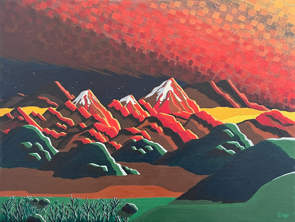 Snowcap Mountain Sunrise (acrylic on canvas) – based on the Mountain Form doodle